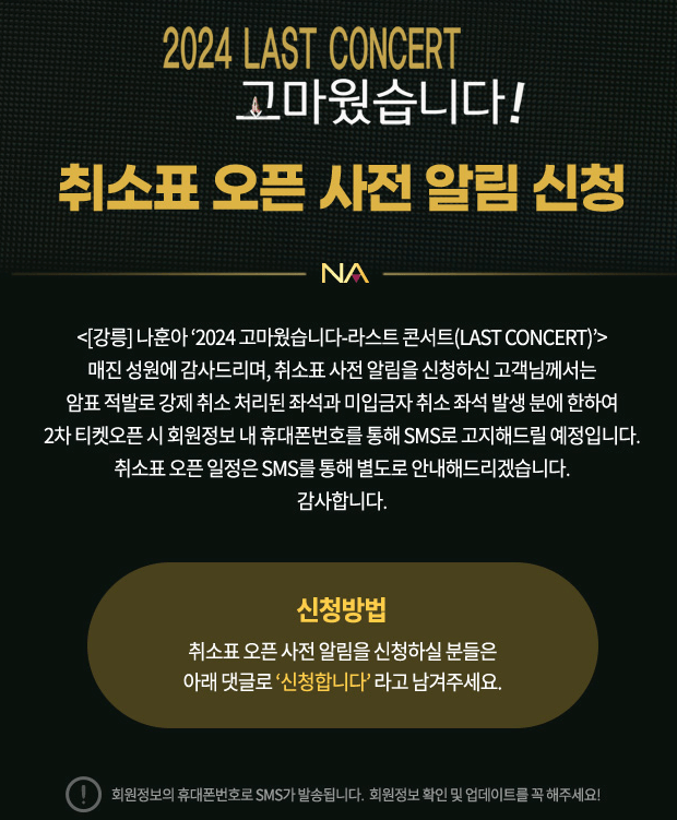 ์ทจ์ํ ์๋งค : ํ์ฌ ๊ฐ๋ฆ์ฝ์ํธ ๋ชจ๋ ํฐ์ผ์ ๋งค์ง๋์๊ณ , ์ทจ์ํ๋ 2์ฐจ ํฐ์ผ์คํ์, SMS๋ก ๋ณ๋์ ์๋ด ์์ ์ ๋๋ค. (ํด๋น ํ์ด์ง์ ๋ฐฉ๋ฌธํด์ ๋๊ธ๋ก '์ ์ฒญํฉ๋๋ค' ๋จ๊ฒจ์ฃผ์ธ์!