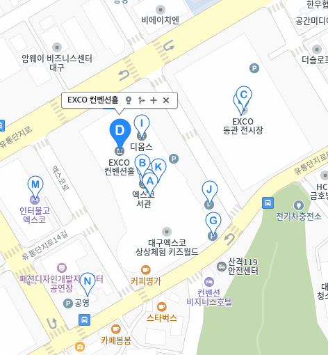 ์ง€๋„์—์„œ ๊ฒ€์ƒ‰ํ•  ๊ฒฝ์šฐ, EXCO ์ปจ๋ฒค์…˜ํ™€(๋Œ€๊ตฌ ๋ถ๊ตฌ ์—‘์Šค์ฝ”๋กœ 10)๋กœ ๊ฒ€์ƒ‰ํ•˜์‹œ๋ฉด ํ™•์ธ์ด ๊ฐ€๋Šฅํ•ฉ๋‹ˆ๋‹ค.