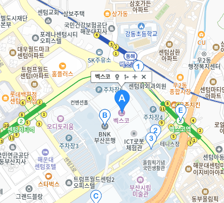 โ–ถ  ์ด์šฉ ๊ฐ€๋Šฅํ•œ ์ง€ํ•˜์ฒ ์€ 2ํ˜ธ์„  ์„ผํ…€์‹œํ‹ฐ(๋ฒก์Šค์ฝ”)์—ญ 1๋ฒˆ์ถœ๊ตฌ 50m, ๋ฒก์Šค์ฝ”(์‹œ๋ฆฝ๋ฏธ์ˆ ๊ด€)์—ญ 9๋ฒˆ์ถœ๊ตฌ 100m / ๋™ํ•ด์„  ๋ฒก์Šค์ฝ”์—ญ 1๋ฒˆ์ถœ๊ตฌ 280m ๊ฑฐ๋ฆฌ์ž…๋‹ˆ๋‹ค.