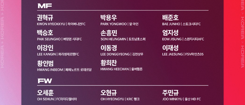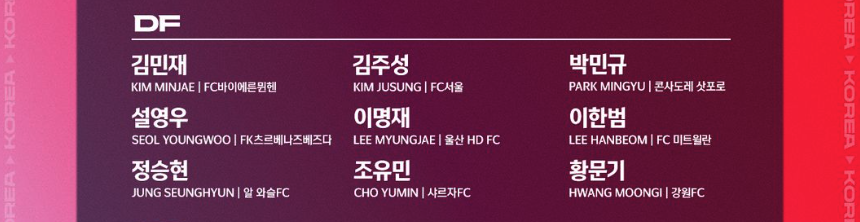 | ๊ถํ๊ท, ๋ฐ์ฉ์ฐ, ๋ฐฐ์คํธ, ๋ฐฑ์นํธ, ์ํฅ๋ฏผ, ์์ง์ฑ, ์ด๊ฐ์ธ, ์ด๋๊ฒฝ, ์ด์ฌ์ฑ, ํฉ์ธ๋ฒ, ํฉํฌ์ฐฌ | ๋ฏธ๋ํ๋ | ๋ชจํ๋ฉ๋์๋ถํฐํ, ๋๋ฅด์๋ผ์๋ธ, ์ด๋ธ๋ผํจ์๋ฐ, ์ด๋ ๋ผํ ๋ฅด๋ธ ๋ฑ |