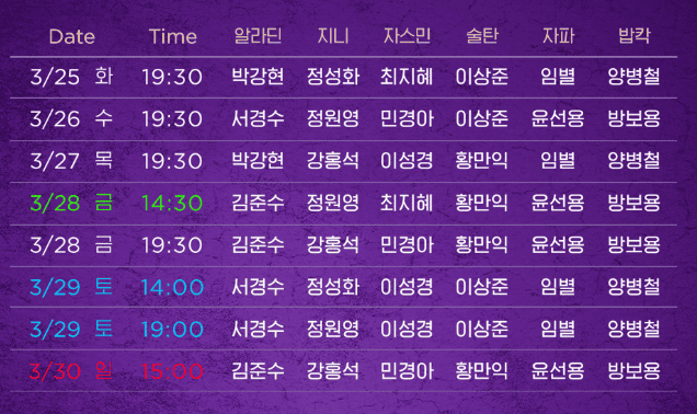 ๋ฎค์ง€์ปฌ ์•Œ๋ผ๋”˜ 3์›” ๊ณต์—ฐ(3/5~3/30) ์บ์ŠคํŒ… ์Šค์ผ€์ค„