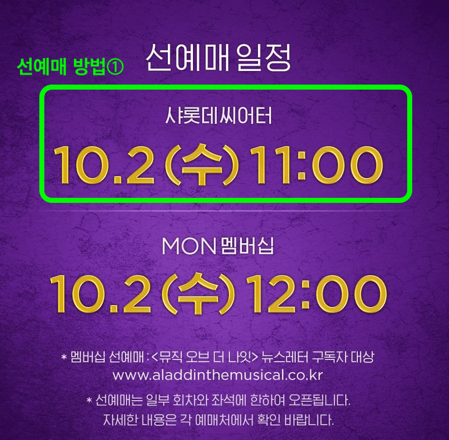 ์„ ์˜ˆ๋งค๋ฅผ ํ•˜๊ธฐ ์œ„ํ•ด์„œ๋Š” ์ผ๋‹จ ๋ฎค์ง€์ปฌ <์•Œ๋ผ๋”˜>์— ๋Œ€ํ•œ ๋‰ด์Šค๋ ˆํ„ฐ ๊ตฌ๋…์‹ ์ฒญ๋ถ€ํ„ฐ ํ•ด์•ผ ํ•˜๋Š”๋ฐ์š”. ํ™ˆํŽ˜์ด์ง€์— ๋‚˜์™€์žˆ๋Š” ์„œ์šธ MON [๋ฎค์ง์˜ค๋ธŒ ๋”๋‚˜์ž‡] ๋ฉค๋ฒ„์‹ญ์ด ๋‰ด์Šค๋ ˆํ„ฐ ๊ตฌ๋… ์‹ ์ฒญ์„ ์˜๋ฏธํ•ฉ๋‹ˆ๋‹ค.