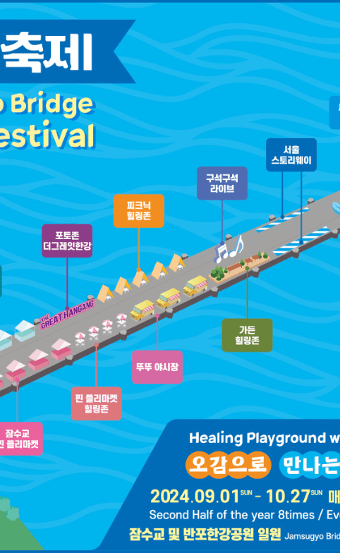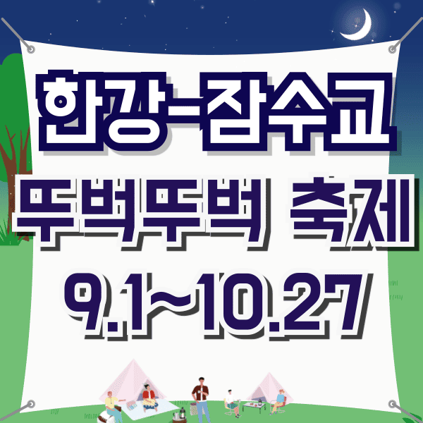 ํ•œ๊ฐ• ์ž ์ˆ˜๊ต ๋šœ๋ฒ…๋šœ๋ฒ… ์ถ•์ œ๋Š” 9.1(์ผ)~10.27(์ผ) ๋งค์ฃผ ์ผ์š”์ผ๋งˆ๋‹ค ์ž ์ˆ˜๊ต ๋ฐ ๋ฐ˜ํฌํ•œ๊ฐ•๊ณต์› ์ผ์›์—์„œ ์—ด๋ฆฝ๋‹ˆ๋‹ค.