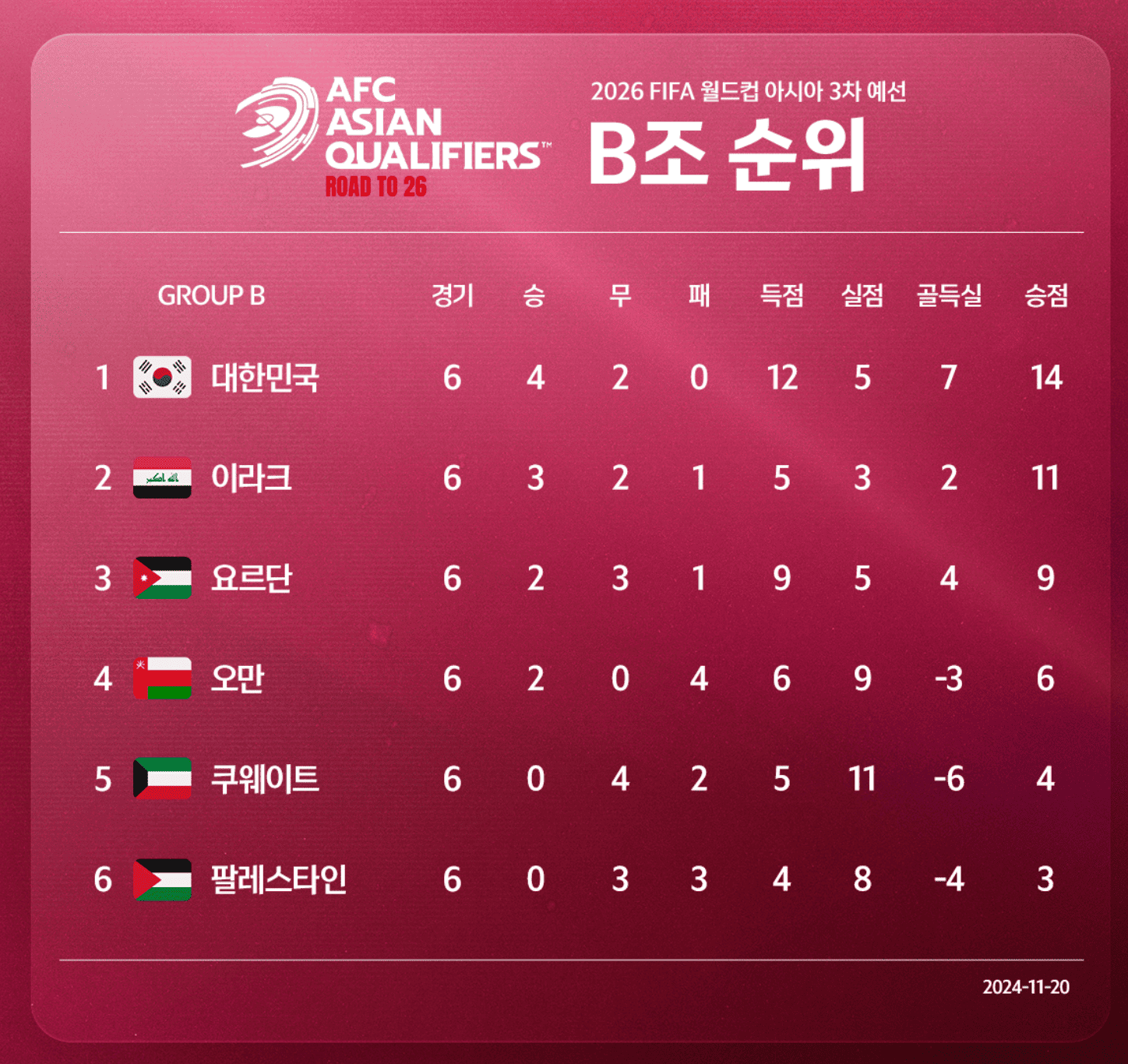 ํ˜„์žฌ ํ”ผํŒŒ๋žญํ‚น ๋ฐ 3์ฐจ ์˜ˆ์„ ์ „ ์ˆœ์œ„์™€ ์Šน๋ฌดํŒจ ๊ฒฐ๊ณผ์ž…๋‹ˆ๋‹ค.